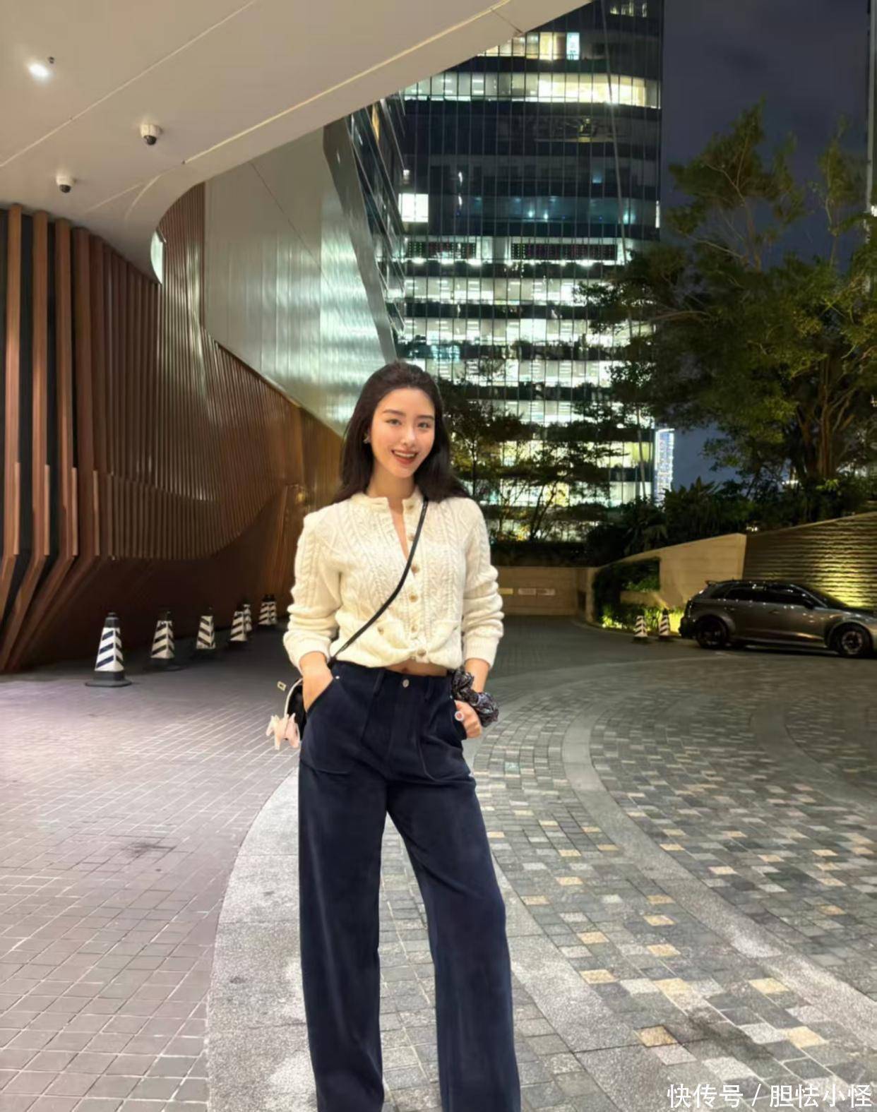 过完整个冬天,如何迎接春夏的浪漫,白色麻花单排扣针织圆领毛衣和黑色长裤,打造出漫不经心的老钱风格,基础款单品不要穿得太老实,隐隐露出肚脐,打开几颗扣子,制造出具有视觉延伸感的V领效果,一双尖头高跟鞋是整个造型的亮点。